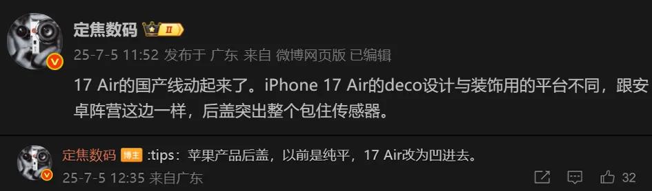 据博主@定焦数码最新爆料,iPhone 17 Air的模组设计与安卓相似,其后盖凸出整个包裹传感器,而且后盖由传统纯平改为凹陷设计。